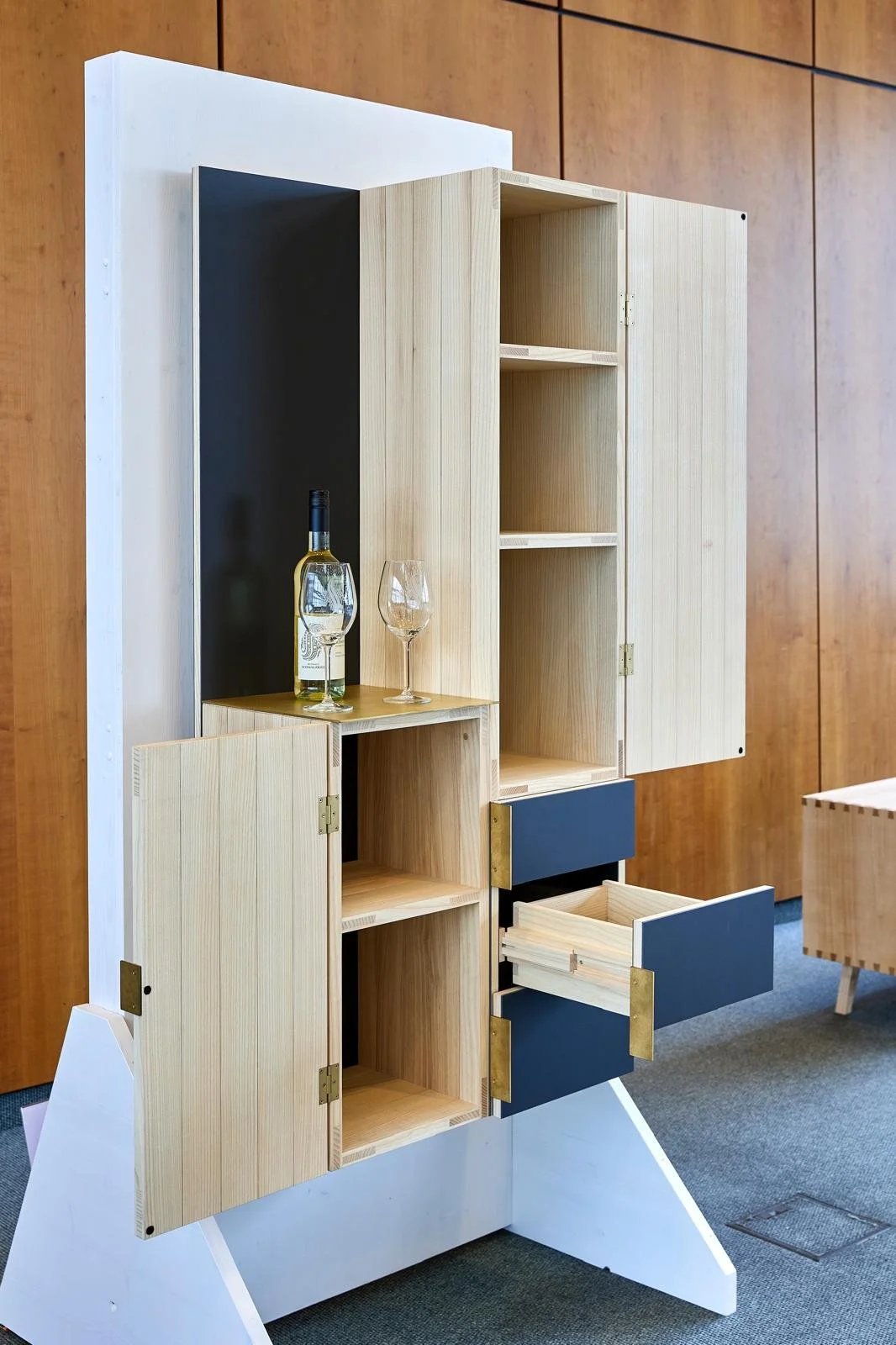 Mein Gesellenstück, “lass liegen.” ist ein Sideboard aus Eiche. Mein ausgezeichnetes Meisterstück, “der gehängte.” ist ein Hängeschrank aus Esche, Linoleum und Messing.